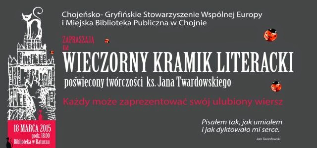 W najbliższą środę 18 marca 2015 o godzinie 18.00 w Miejskiej Bibliotece Publicznej w Chojnie odbędzie się II Wiosenny Kramik Literacki. W tym roku poświęcony osobie i twórczości ks. Jana Twardowskiego. Uczestnicy Wieczoru mogą wybrać swój ulubiony