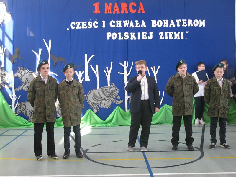 Z okazji Narodowego Dnia Pamięci Żołnierzy Wyklętych tradycyjnie przygotowali uroczystość upamiętniającą tragiczny los "oszukanych, porzuconych, nieugiętych" oraz ich nierówną walkę i poświęcenie. W tym roku również obejrzeliśmy montaż słowno-muzyczny nawiązujący do burzliwych dziejów z naszej historii. Z uwagą wysłuchaliśmy pieśni i piosenek w wykonaniu solistów i chóru, poświęconych "żołnierzom z lasu", ich rodzinom i dowódcom, obejrzeliśmy "Taniec wilków", a także mogliśmy uczestniczyć w Apelu Poległych. Recytatorzy przypomnieli wszystkim imiona, nazwiska i pseudonimy dowódców oddziałów podziemia niepodległościowego oraz fakty i wydarzenia historyczne. Nawiązaniem do tamtych dni była przygotowana dekoracja, mundury żołnierzy, a także rekwizyty pojawiające się na scenie. Na zakończenie uroczystości zaprezentował się w barwach narodowych zespół ,"Do-re- mi". Wspólnie złożyliśmy hołd Żołnierzom Niezłomnym za "ofiarę z życia złożoną", dziękując za wolną Ojczyznę.