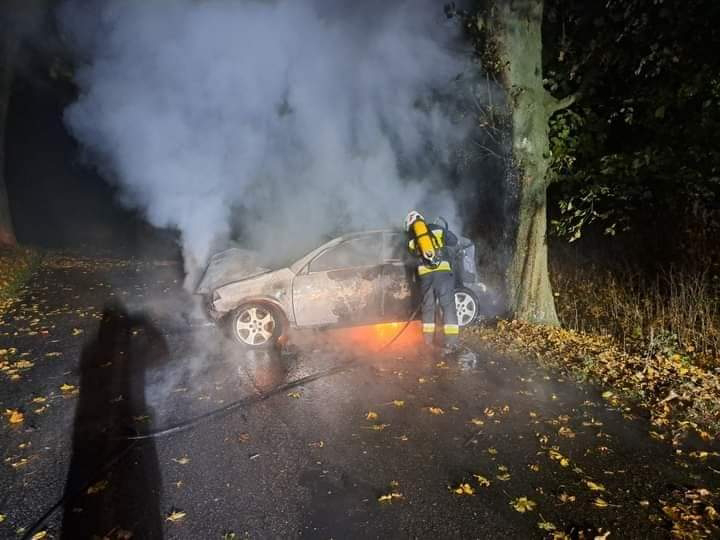 Kierowca samochodu osobowego stracił panowanie nad autem i wjechał w drzewo. Pojazd zapalił się. Do wypadku doszło nad ranem.